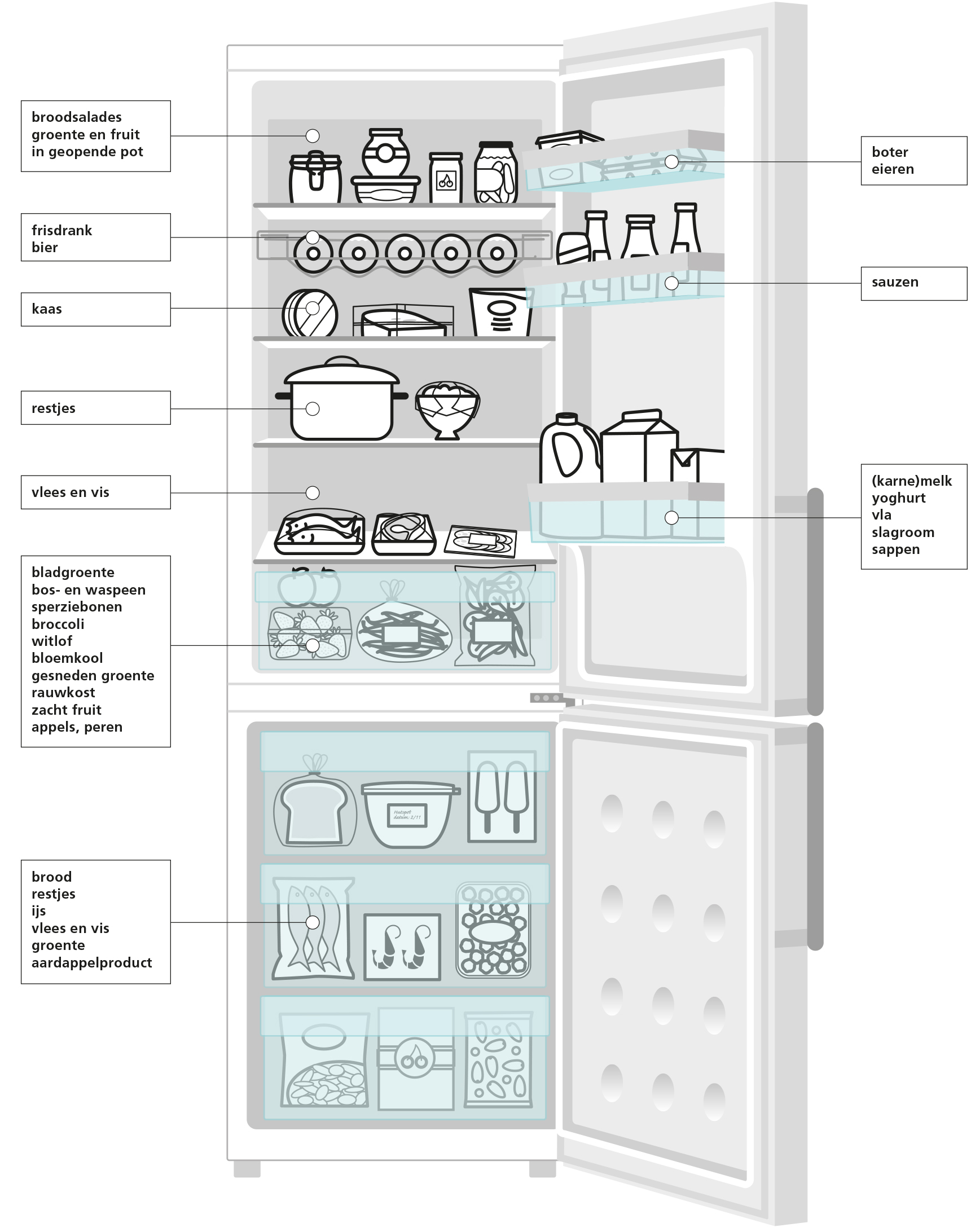 Neem vandaag een moment om je koelkast te reorganiseren volgens bovenstaand plan en houd dan ook die indeling aan. Dan vind je producten en voedingsmiddelen gemakkelijker terug en hoeft de koelkast minder lang open te staan. Beter voor milieu en portemonnee.