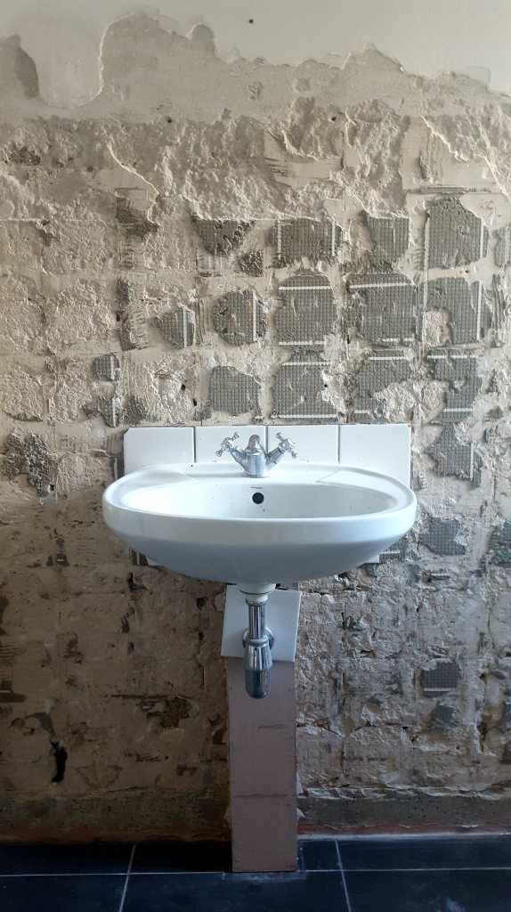 Een week lang deden we het met een waskom voorzien van vijf tegeltjes. Wel heel minimalistisch natuurlijk. 😉
