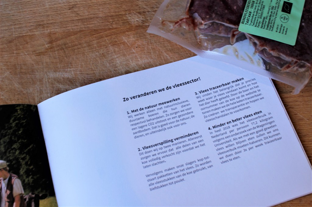 Dit hierboven zijn persoonlijke voordelen; maar het kopen van vlees op deze wijze heeft nog meer pluspunten. Je stimuleert er goed (biologisch) boeren mee, maar ook een bedrijf wat het mogelijk maakt om zo natuurgetrouw mogelijk vlees te consumeren. Als ik niet in de stad woonde maar op een boerderij, zou ik zo omgaan met onze koe: goed voer, een paar mooie jaren in de wei, naar een bekende slager als de tijd daar was. Ik begrijp deze keten en deze keuzes en accepteer dus ook dat het zo’n 5 weken kan duren voor het vlees er is; iets wat sommige mensen als een nadeel zien.