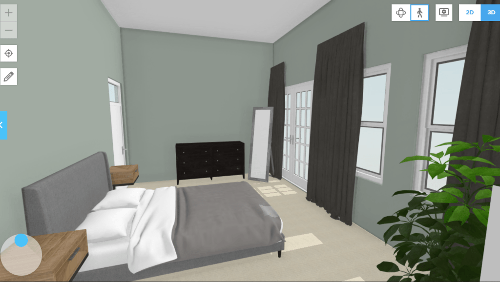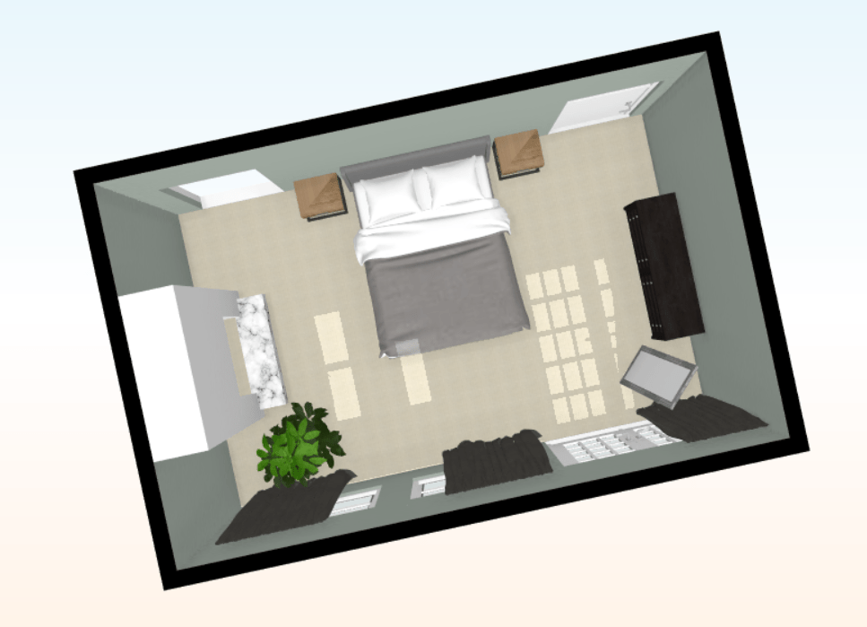 De kamer wordt – je verwacht het niet van deze minimalist – vrij simpel ingedeeld. Het is een slaapkamer, ik vind het belangrijk dat het er rustig, functioneel en netjes, maar ook “zacht” en ontspannend is. Wat het bed betreft, daar zijn we nog niet helemaal uit, mogelijk dat we voorlopig ons huidige bed naar deze kamer verplaatsen. Ik wil wel graag twee ‘nieuwe’ (kan: tweedehands) nachtkastjes en een ladekast voor ondergoed, badkleding etc. Verder blijft de grote zwarte haard een eyecatcher in de ruimte (op de plattegrond is hij wit, maar de schouw is zwart graniet). Een passpiegel maakt het af.