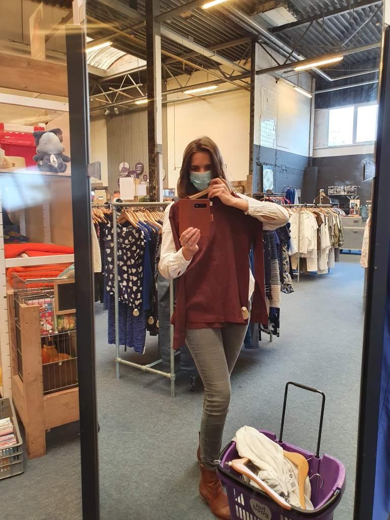 Hoewel het rustig was, vond ik het toch wel belangrijk om m’n mondkapje te dragen (en afstand te houden uiteraard). Ik heb de kleren ook niet gepast, ik heb ze “voor me gehouden” en in deze staande spiegel gekeken of de kleur wat voor me was.