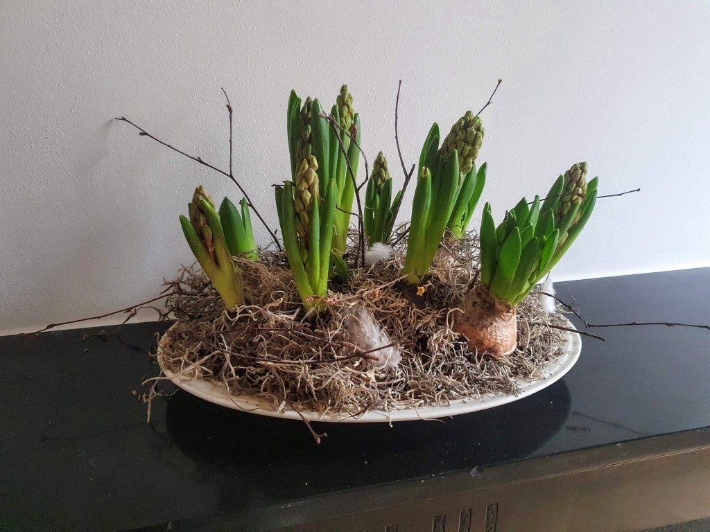 Mijn eerste poging tot een paasbloemstuk, iets wat ik op m’n bucketlist heb staan. Ik ben niet geboren met groene vingers, maar dat weerhoudt me er niet van om erop los te fröbelen 😉 Ook mooi hoe ze met z’n allen netjes bij elkaar staan te shinen, en die ene denkt: “doooeeiiiii”