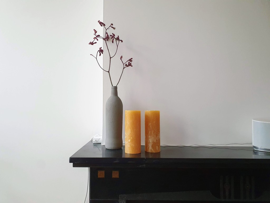 Twee simpele gele kaarsen geven een instant-paasgevoel op de schouw in de eetkamer. Met Pasen staan ze op de gedekte tafel. De vaas is een DIY.