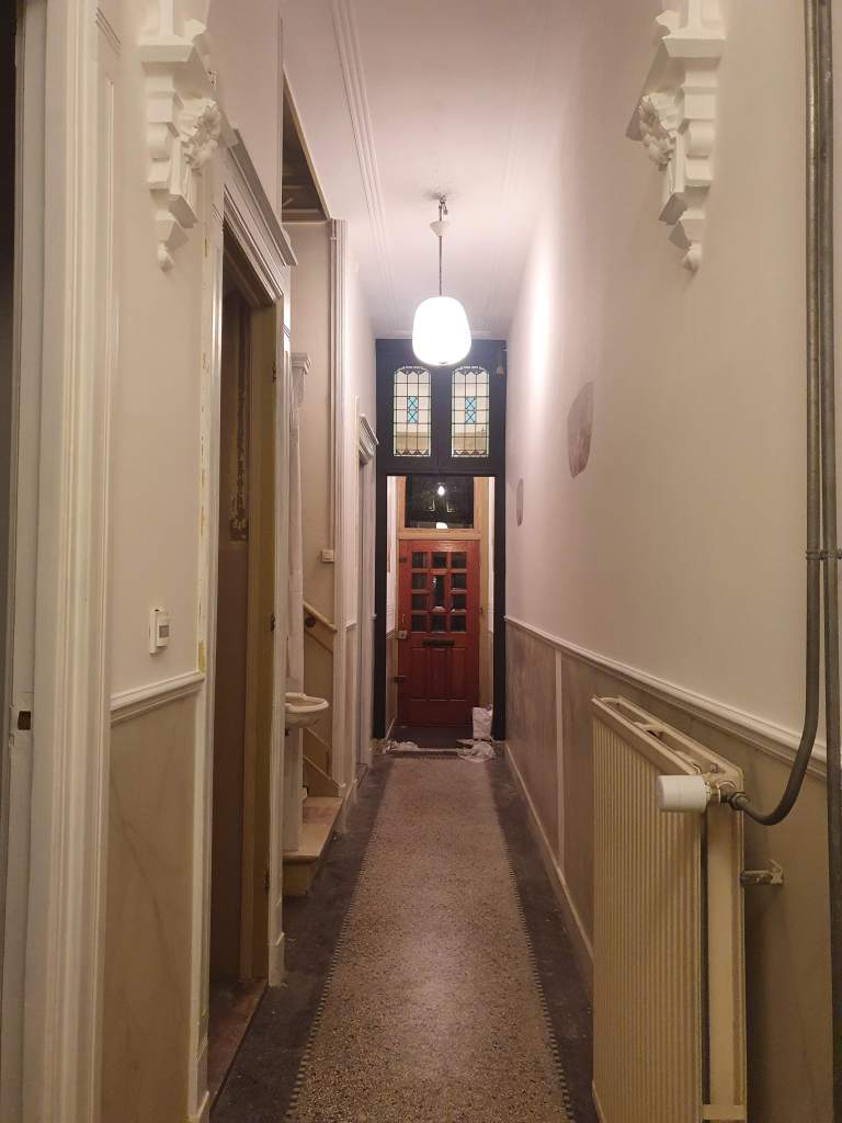 De vestibule (inkomhal) is hetgeen waar mijn vriend nu vooral bezig is. Ook hier is het grove werk gedaan en staat er al heel wat (waaronder onze glas-in-lood deur) in de lak. Toch is er nog aardig wat houtwerk wat afgelakt moet worden en ben ik op zoek naar een lamp voor deze ruimte, aangezien er nu slechts een peertje hangt. Het marmer moet schoongemaakt worden en er moet een nieuw luik komen voor bij de voordeur (om bij de nutsvoorzieningen te kunnen komen). Een nieuwe schoonloopmat maakt het af. Ik hoop dat we dit in juli gereed hebben.