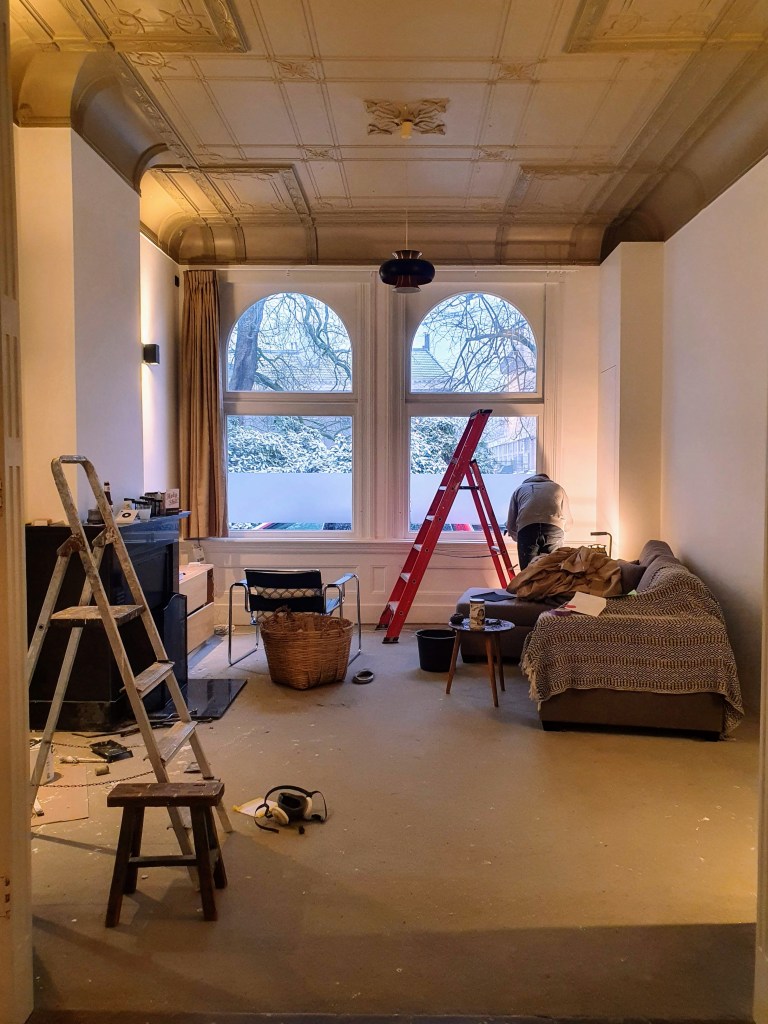 Ook hebben we 8 deuren in deze ruimte (de deuren van de inbouwkasten nog niet meegerekend) en moeten die nog voorzien worden van lak. De plinten moeten nog geschilderd en ik wacht nog op twee meubels die ik heb besteld.