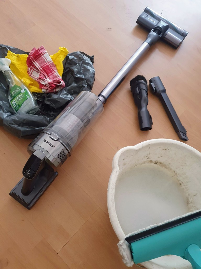 Enfin, dat kon zo écht niet langer. Dus pakte ik mijn favoriete opruim- en schoonmaaktools erbij en ging ik aan de slag. Ik gebruik daarvoor maar een paar dingen, waarvan m’n nieuwste liefde de Samsung Jet 90 Complete steelstofzuiger is. Eigenlijk past het woord stofzuiger niet zo goed. Ik ben nog nooit zo blij geweest met een stofzuiger. Ik bedoel: onze bouwstofzuiger is heerlijk hoor, maar daarmee kan ik geen lamellen schoonmaken of vloeren dweilen. Dat kan met de Jet wel.