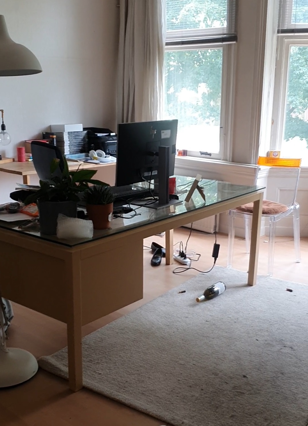 De plek van de ramp? Mijn werkkamer. Die in de afgelopen tijd afwisselend gebruikt werd door mij (zeg maar 24-7 want ja, thuiswerken), stalplaats voor allerhande klusspullen en meubels (want: verbouwing), gasten die bleven slapen (want: avondklok) en – misschien nog wel de grootste boosdoener – een stel katten die het heerlijk vinden dat ik de hele dag thuis ben en die het kleed als hun forever-ever plek hebben geclaimd.