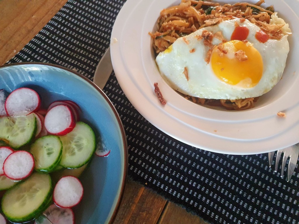 Op dag 1 had ik het makkelijk: er was nog een restje bami over, maar dat was niet genoeg voor drie personen. Er lagen nog mie-noodles in de kast en er was nog wat andijvie, wat ook niet genoeg was voor een hele maaltijd. Ik wokte de andijvie met wat olie, knoflook, hot sauce en ketjap manis en roerbakte daarna de kort gekookte noedels en inmiddels ontdooide bami erdoor. De komkommer en radijzen gingen een poosje in een mix van azijn, snufje zout en suiker. Een spiegeleitje maakte het af: