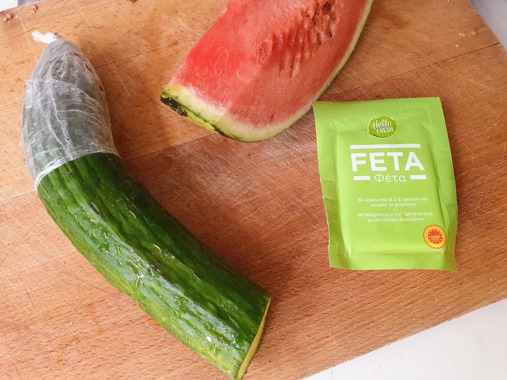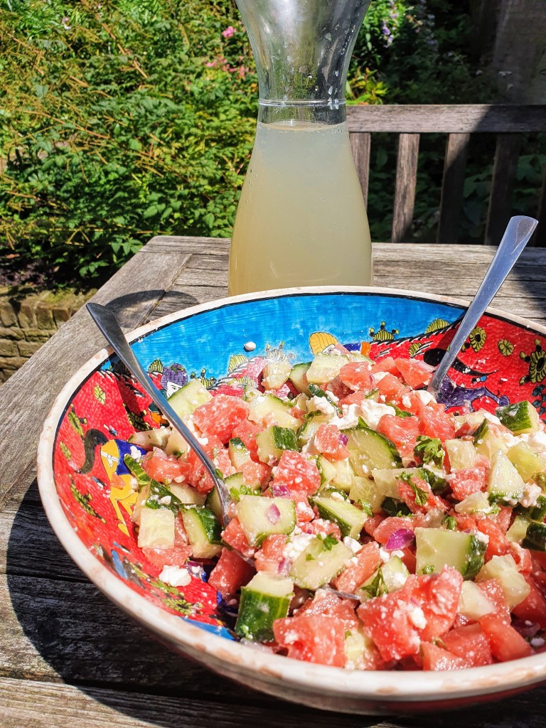 Dit was een extraatje, en omdat ‘ie ook in de categorie “voorraadkoken” valt, neem ik ‘m mee. Er was nog feta over, net als komkommer (ik realiseer me nu dat dit een ahum wat aparte foto is…) en de watermeloen kon ook niet heel veel langer meer mee. Dus: samen met wat peterselie (had geen munt) uit de tuin, wat olie van de voorraad en een paar uiensnippers werd dit een heerlijk maaltje voor de lunch. De citroenlimo is overigens ook #homemade.