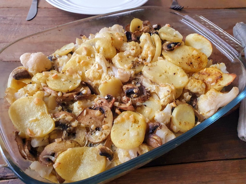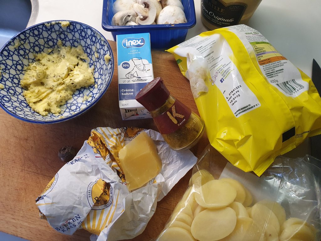 Op een regenachtige zomerdag maakte ik deze stevige ovenschotel en die ging erin als koek. Ik vette een ovenschaal in, dumpte de bloemkoolroosjes en aardappelpartjes erin. Sneed de champignons in plakjes en husselde het geheel door elkaar in de schaal. Van de slagroom klopte ik samen met één ei (niet op de foto), de kerrie, mosterd en de geraspte nootmuskaat en wat zout en peper een sausje. Dat goot ik over de schotel en topte ik af met wat fijngehakte kaas en enkele toefjes van m’n kruidenboter. Et voila: 20 minuten later…