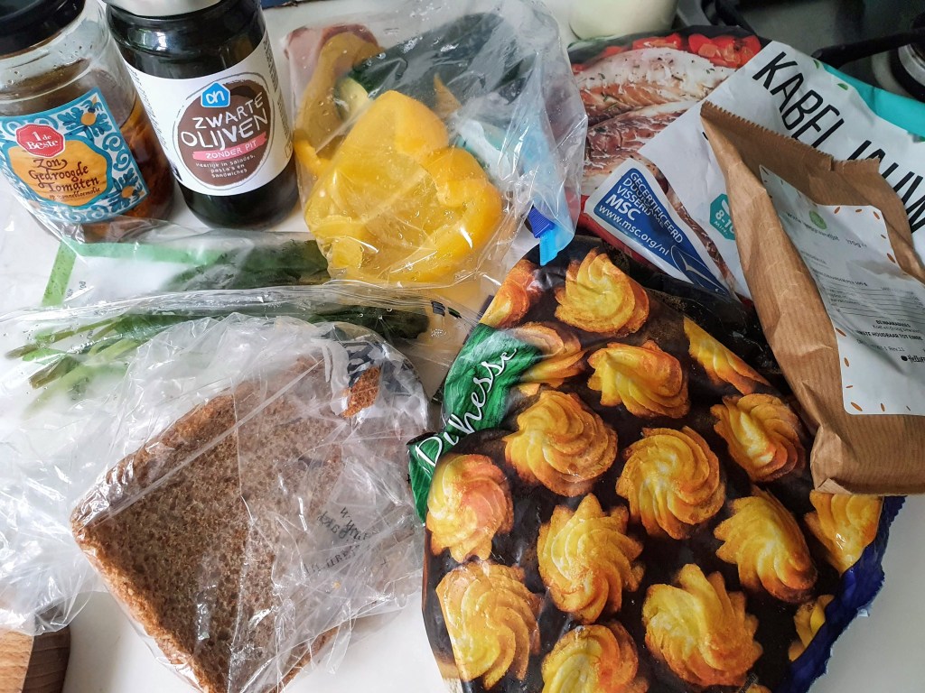 Deze vroeg om wat meer creativiteit. Ik ontdooide de kabeljauwfilet – twee kleine stukjes waren het nog – en roosterde het broodkapje in het broodrooster. Vervolgens mixte ik het verkruimelde sneetje brood met wat fijngesneden zongedroogde tomaat, wat in plakjes gesneden olijf en kappertjes en legde ik dat mengsel op de filets in een ovenschaaltje. De groente sneed ik fijn. Samen met de paar pommes duchesse die er nog waren ging alles – met wat rode uienringen die er ook nog over waren en een lading olijfolie en gedroogde mediterraanse kruiden – op een bakplaat. Het had zo’n 30 minuten nodig. Ik mengde de groente nog met wat zwarte olijven en met de basilicum: