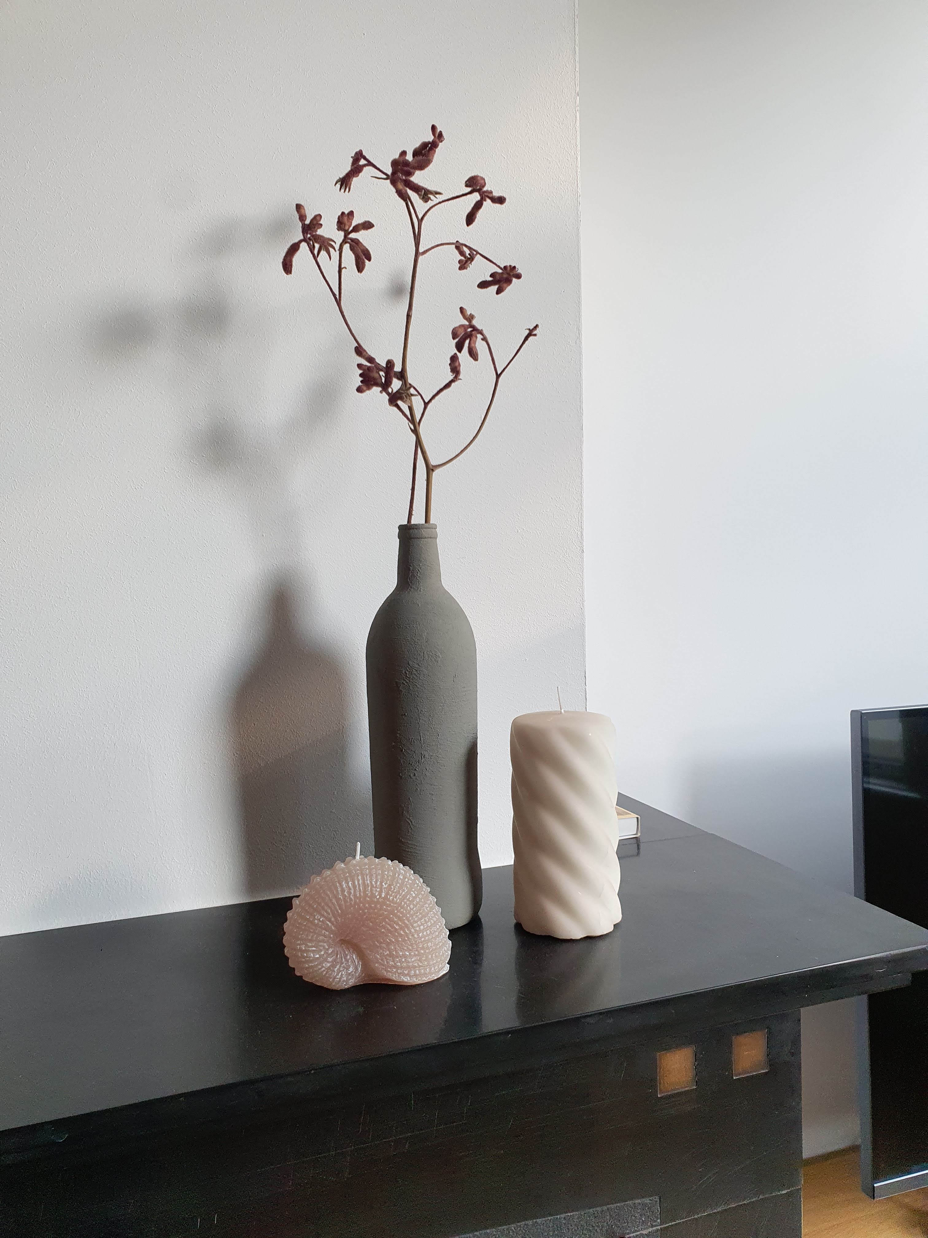 Kaarsen in schelpenkleuren van Zara. De fles is een hack: het was gewoon een glazen olijffles, nu lijkt ie van aardewerk.