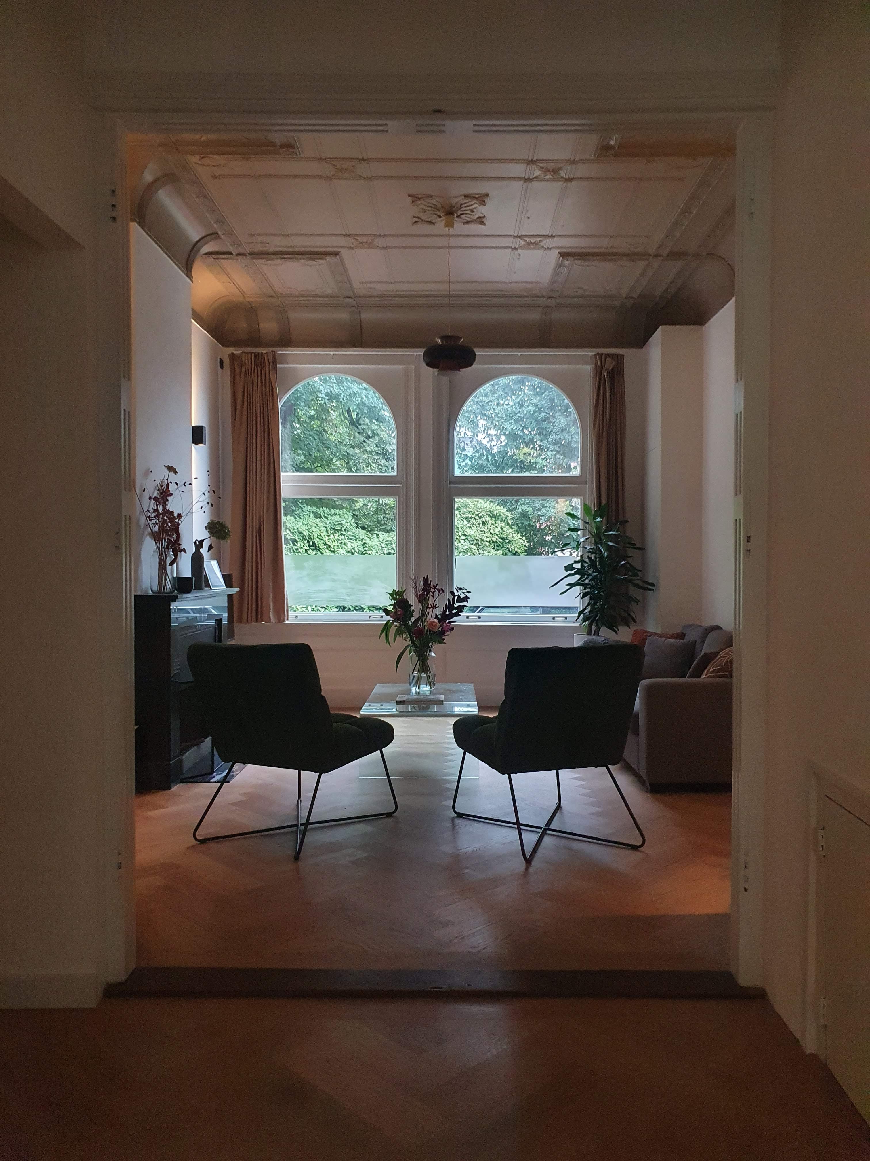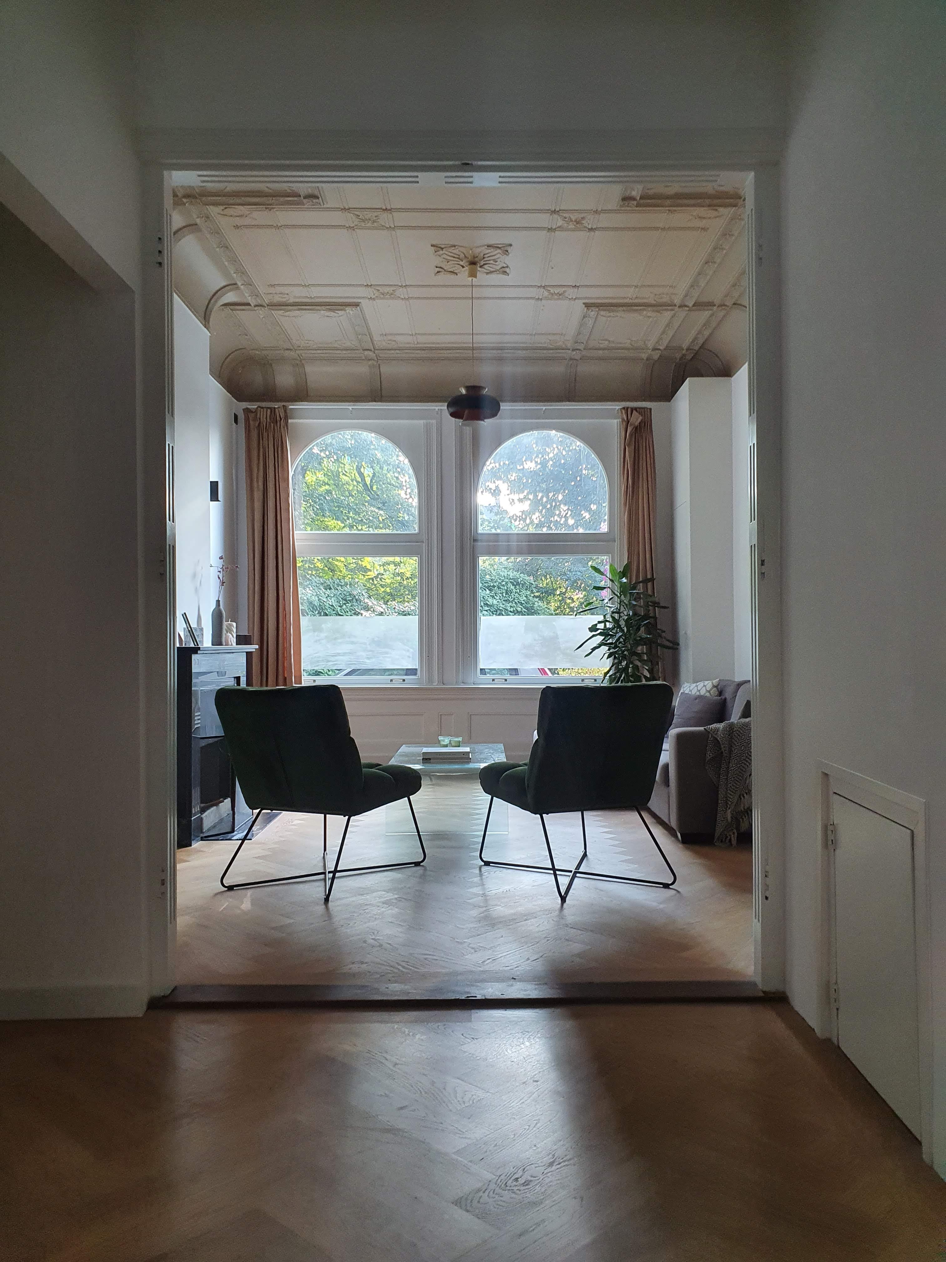 De bank die we al in alle voorgaande huizen hadden en die toch behoorlijk intensief gebruikt wordt. De fauteuils zijn echter nieuw, al zag je ze op de eerste foto van de zomerse inrichting ook al. Ze zijn van groen fluweel en zitten heerlijk. Op tafel een Bloomon-bos, ik geef mezelf er elke 3 weken eentje cadeau en ben er vrijwel altijd superblij mee. Meestal staan de bloemen tot de nieuwe bos komt!