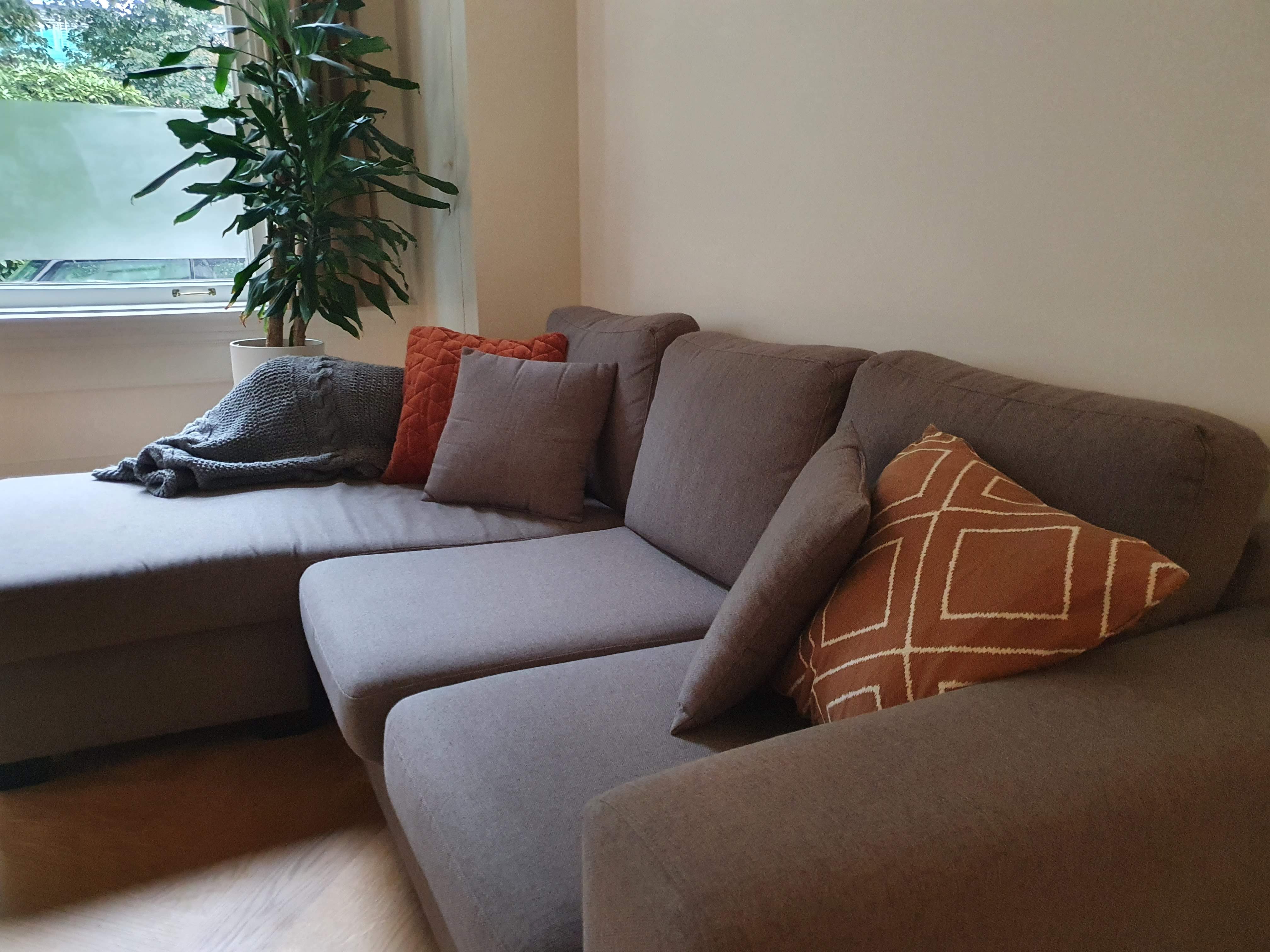 De wisseling is meteen zichtbaar: ik heb met behulp van accessoires in oranje- en bruintinten de bestaande bruintinten in de ruimte benadrukt. En ja, het was inderdaad ook gewoon keihard aan het regenen buiten, dus erg licht zijn de foto’s niet.