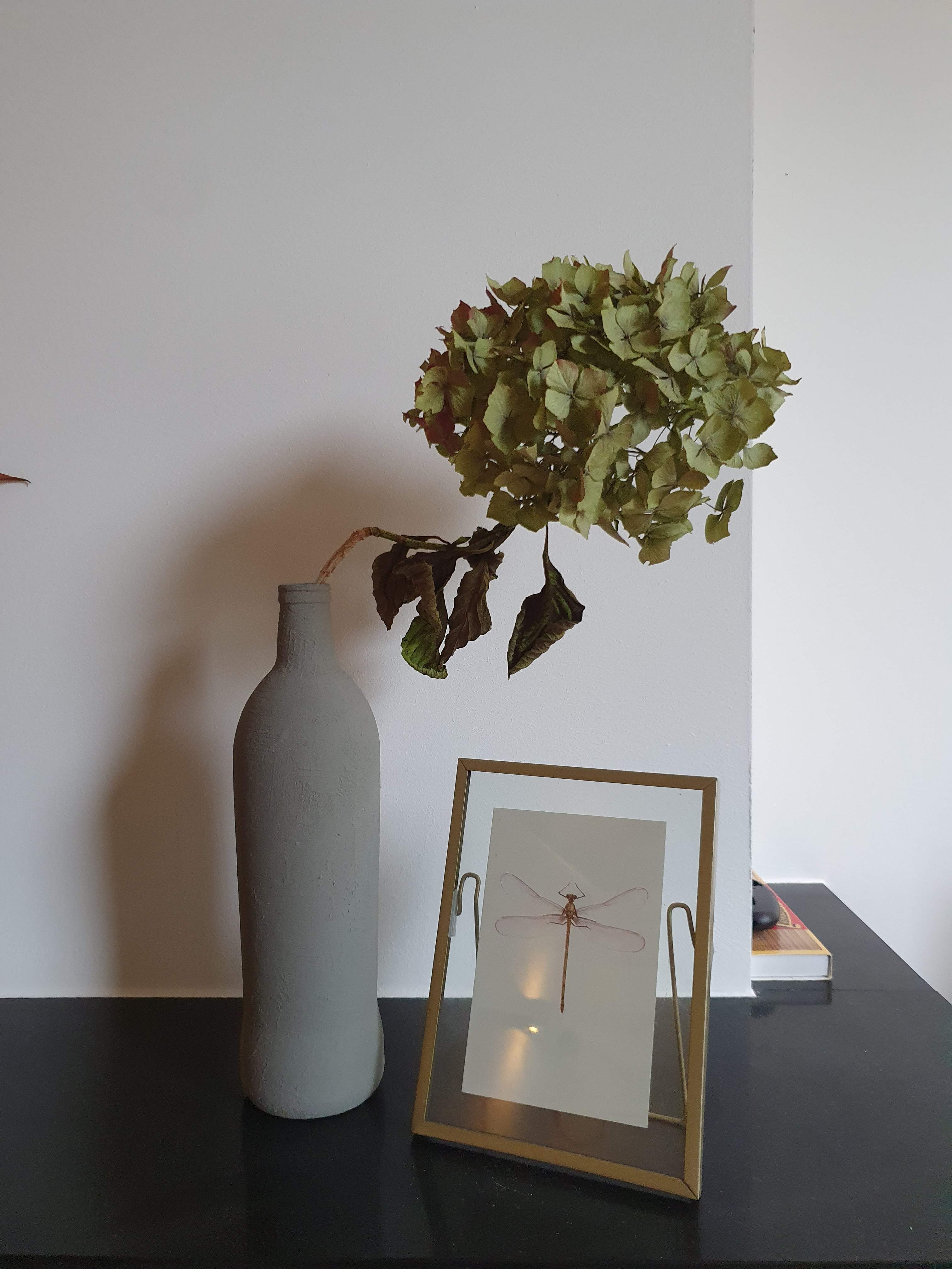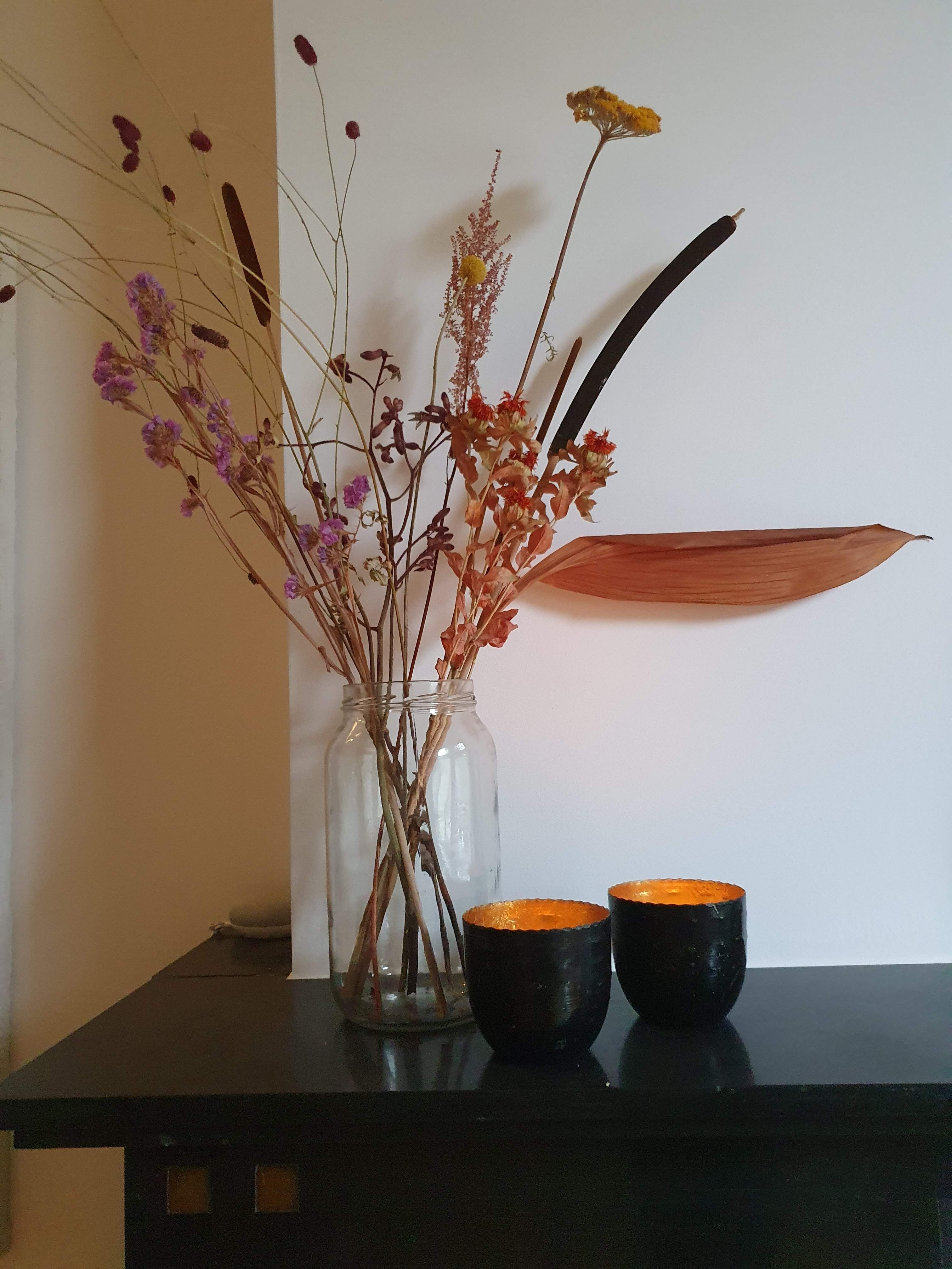 Hortensiabloem uit de tuin die ik laat indrogen. De bos van droogbloemen die hieronder beter te zien is, is van allerlei takken die ik zelf heb gedroogd. Ik vind dat zo bij het najaar passen! Waar de theelichthouders vandaan komen weet ik niet; die stonden al in Mr Dutchie’s vrijgezellenhuis.