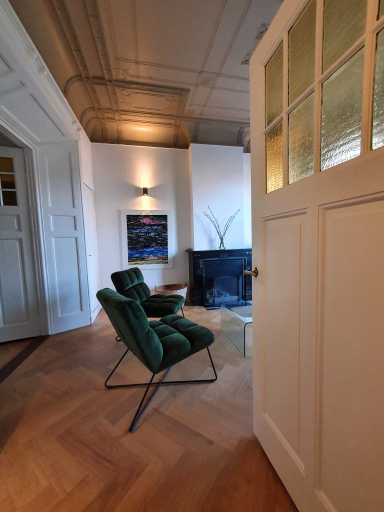 De stoelen zijn wel echt nieuw. Ik zocht langere tijd voor tweedehands exemplaren, maar kon helaas niets vinden wat goed paste. Deze zijn diepgroen (het is een thema) en gecapitonneerd, maar zonder knopen.