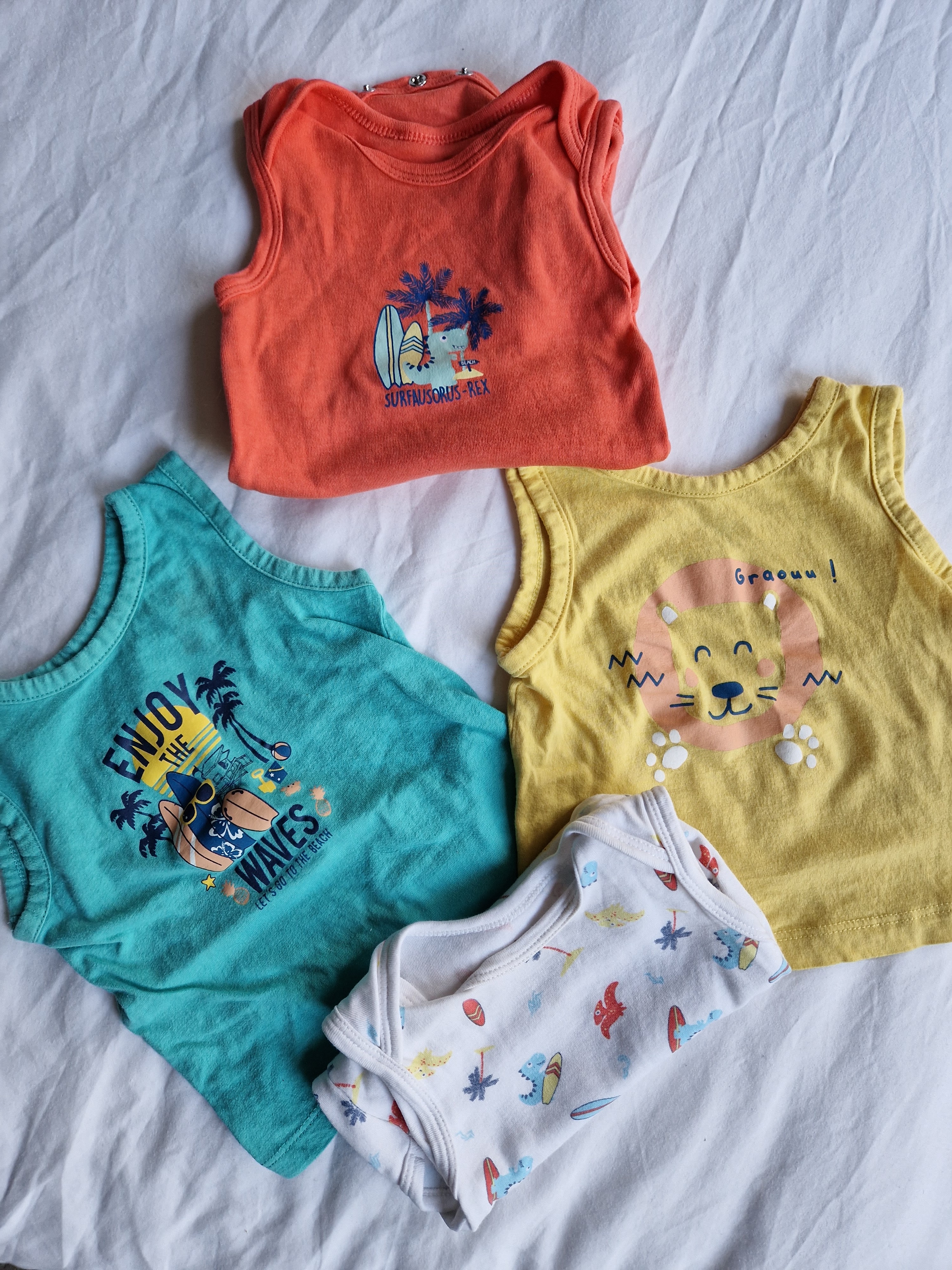Omdat het op zijn kinderopvang snel erg warm wordt binnen en ik verwacht dat we – net als vorig jaar – nog wel eens een hittegolf kunnen krijgen, vulde ik deze basis aan met een paar extra zomerse kledingstukken: