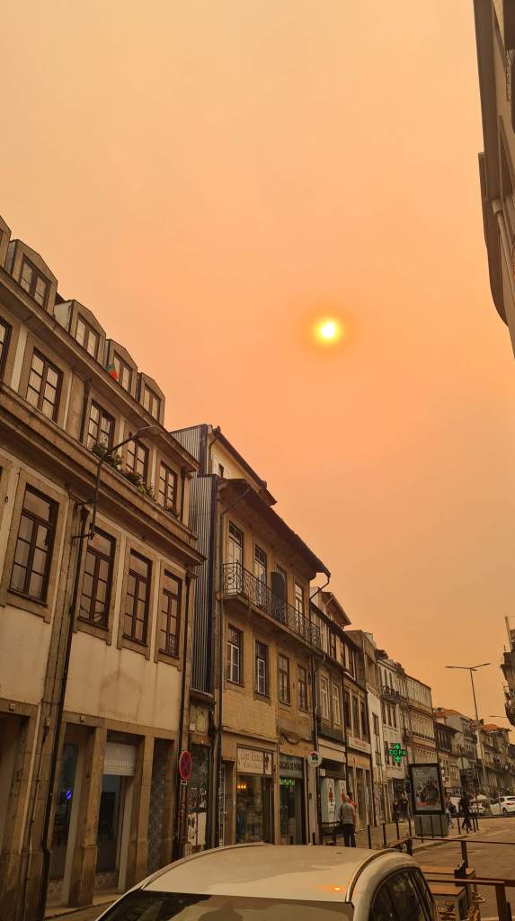 Vol enthousiasme rijden we nog richting Porto. Maar het zicht wordt steeds slechter; steeds als we een nieuwe vallei binnenrijden is er meer rook. We zien hellingen in de brand staan. Ik denk echter nog steeds: “Porto ligt aan de kust, daar zal het wel mee vallen…” maar niets blijkt minder waar. Eenmaal in Porto is het grauw en grijs en zie je het einde van de straat niet eens. We stappen uit bij ons appartement en de as dwarrelt als sneeuw naar beneden. Een winkelier ziet ons met de kleintjes en komt naar buiten: dit is geen veilige plek met ukkies, besluit ze.